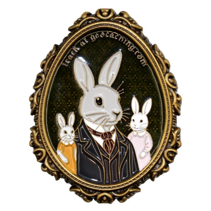 Der „Distinguished Rabbits“-Geocoin 2026 ist auf Geocaching.com mit einem einzigartigen Symbol trackbar.