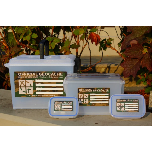 Diese wetterfesten Vinyl-Etiketten sind besonders widerstandsfähig. Sie enthalten offizielle Geocache-Informationen und können direkt mit deinen Cache-Daten beschriftet werden.